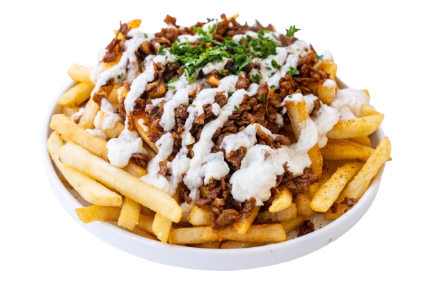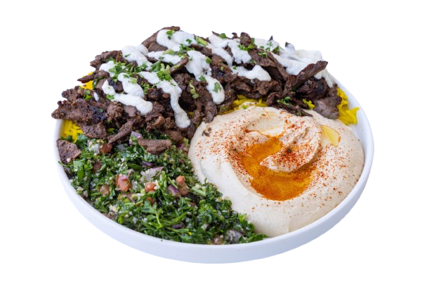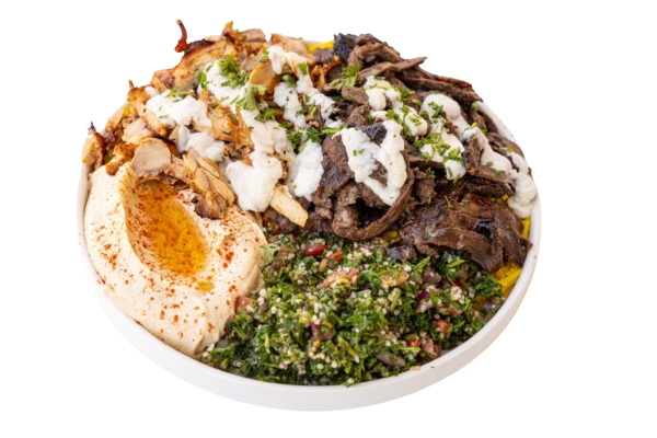 Marinated wagyu beef shawarma and marinated chicken shawarma drizzled with our signature garlic sauce and served with yellow rice, hummus, tabouli, and a side of pita bread.
